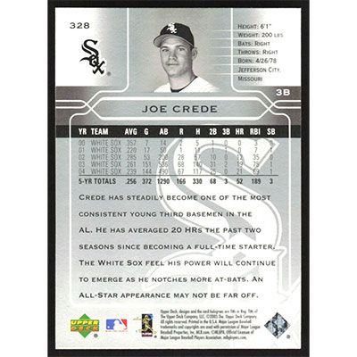 This is a 2005 Upper Deck Joe Crede baseball card. The card is #328 and pictures show condition.