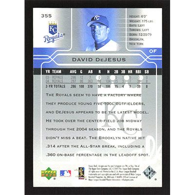 This is a 2005 Upper Deck David DeJesus baseball card. The card is #355 and pictures show condition.