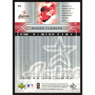 This is a 2005 Upper Deck Roger Clemens baseball card. The card is #90 and pictures show condition.