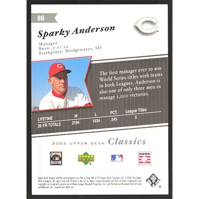 This is a 2005 Upper Deck Classics Sparky Anderson baseball card. The card is #86 and pictures show condition.