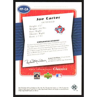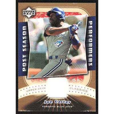 This is a 2005 Upper Deck Classics Post Season Performers Materials Joe Carter Jersey baseball card. The card is #PP-CA and pictures show condition. Team(s): Toronto Blue Jays
