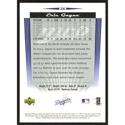 This is a 2005 Upper Deck MVP Eric Gagne baseball card. The card is #26 and pictures show condition.