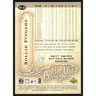 This is a 2005 Upper Deck MVP Batter Up! Rollie Fingers baseball card. The card is #BU-36 and pictures show condition.