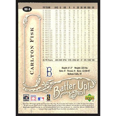 This is a 2005 Upper Deck MVP Batter Up! Carlton Fisk baseball card. The card is #BU-8 and pictures show condition.