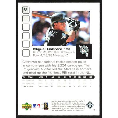 This is a 2005 Upper Deck Pros & Prospects Miguel Cabrera baseball card. The card is #62 and pictures show condition.