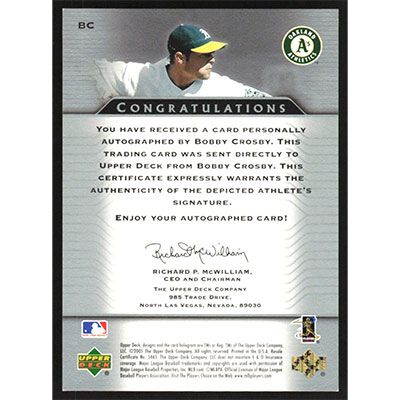 This is a 2005 Upper Deck Signature Sensations Bobby Crosby autographed baseball card. This card has been signed, in blue, by Bobby Crosby, and is certified authentic by Upper Deck. The card is #BC and pictures show condition. This card is limited; #'d 15-Apr.