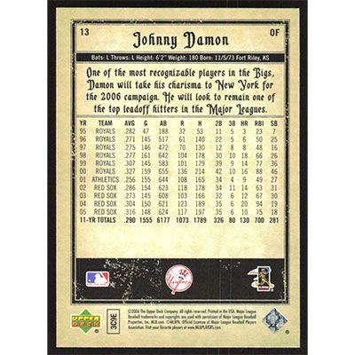 This is a 2006 Artifacts Johnny Damon baseball card. The card is #13 and pictures show condition.
