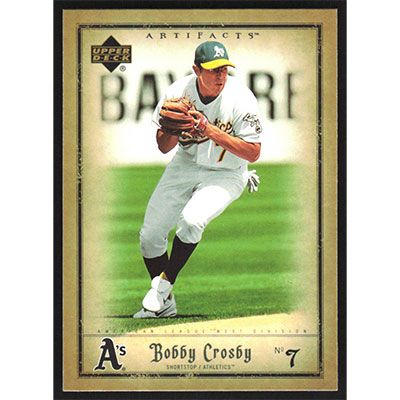 This is a 2006 Artifacts Bobby Crosby baseball card. The card is #64 and pictures show condition.