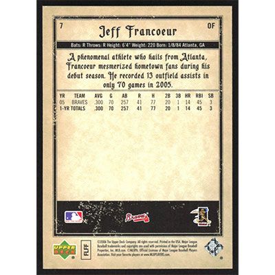 This is a 2006 Artifacts Jeff Francoeur baseball card. The card is #7 and pictures show condition.