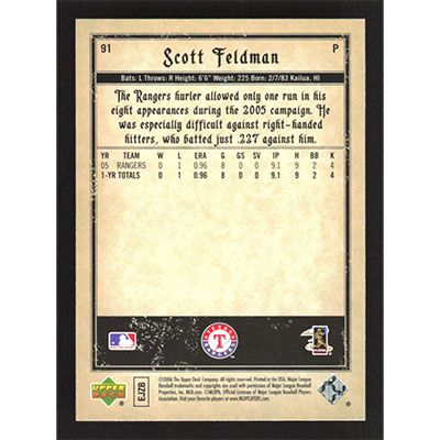 This is a 2006 Artifacts Scott Feldman baseball card. The card is #91 and pictures show condition.