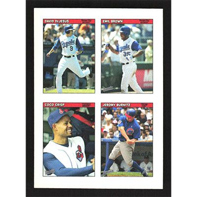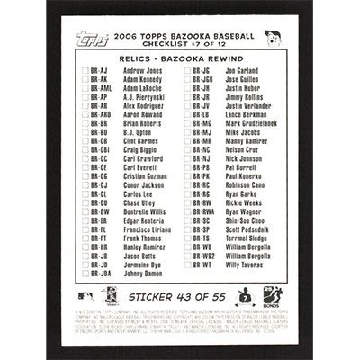 This is a 2006 Bazooka 4 on 1 Stickers David DeJesus, Emil Brown, Coco Crisp and Jeromy Burnitz Checklist baseball card. The card is #43 and pictures show condition.