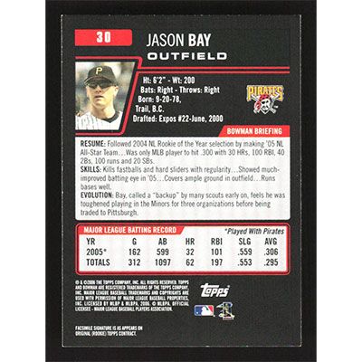 This is a 2006 Bowman Jason Bay baseball card. The card is #30 and pictures show condition.