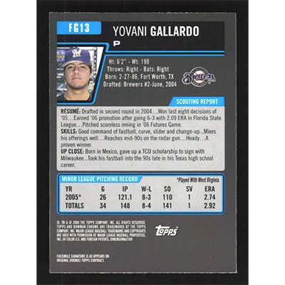 This is a 2006 Bowman Chrome Draft Future's Game Prospects Yovani Gallardo baseball card. The card is #FG13 and pictures show condition. Team(s): Milwaukee Brewers