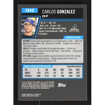 This is a 2006 Bowman Chrome Draft Future's Game Prospects Carlos Gonzalez baseball card. The card is #FG43 and pictures show condition. Team(s): Arizona Diamondbacks