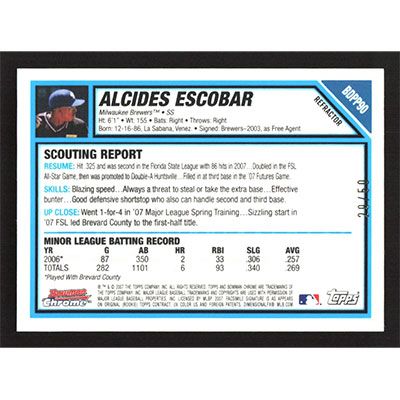 This is a 2006 Bowman Chrome Draft Future's Game Prospects Gold Refractors Alcides Escobar baseball card. The card is #BDPP90 and pictures show condition. This card is limited; #'d 29/50.