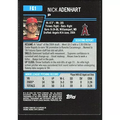 This is a 2006 Bowman Draf Futures Game Prospects Nick Adenhart baseball card. The card is #FG1 and pictures show condition.