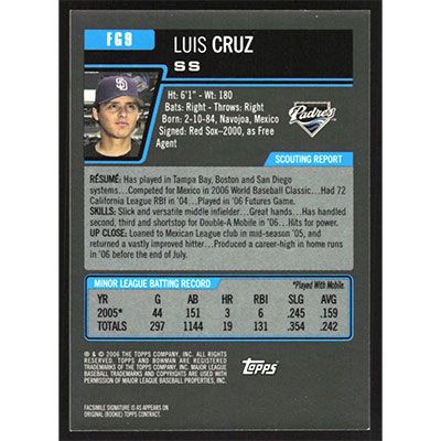 This is a 2006 Bowman Draft Future's Game Prospects Gold Luis Cruz baseball card. The card is #FG9 and pictures show condition. Team(s): San Diego Padres