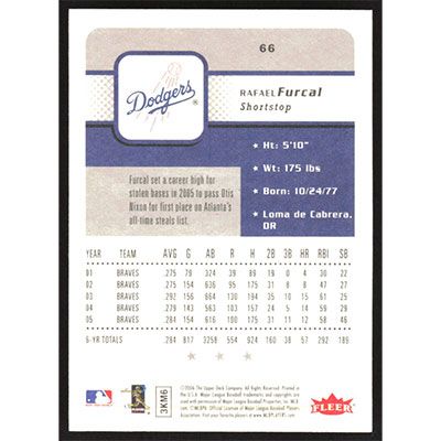 This is a 2006 Fleer Rafael Furcal autographed baseball card. This card has been signed, in blue, by Rafael Furcal, and is guaranteed authentic by Ballcardz.com. The card is #66 and pictures show condition.