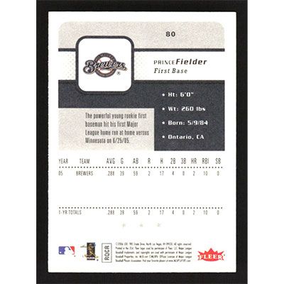 This is a 2006 Fleer Prince Fielder baseball card. The card is #80 and pictures show condition.
