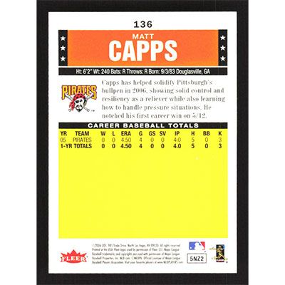 This is a 2006 Fleer Tradition Matt Capps autographed baseball card. This card has been signed, in blue, by Matt Capps, and is guaranteed authentic by Ballcardz.com. The card is #136 and pictures show condition.