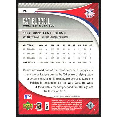 This is a 2006 SP Authentic Pat Burrell baseball card. The card is #71 and pictures show condition.