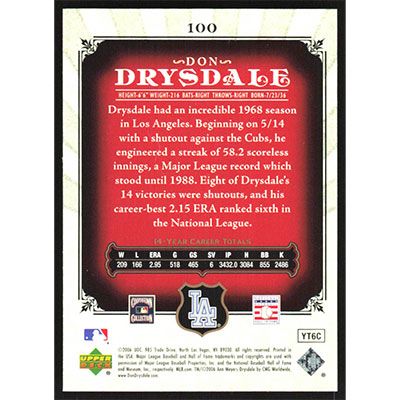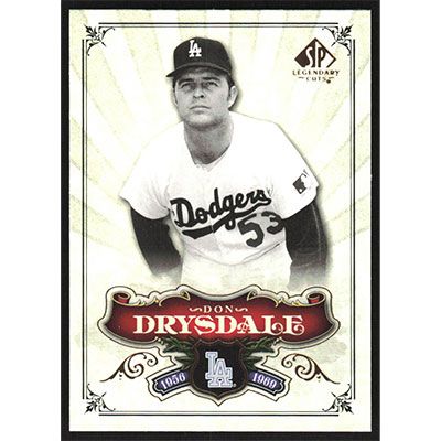 This is a 2006 SP Legendary Cuts Don Drysdale baseball card. The card is #100 and pictures show condition.