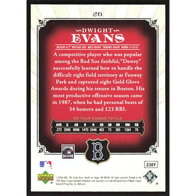 This is a 2006 SP Legendary Cuts Dwight Evans baseball card. The card is #26 and pictures show condition.