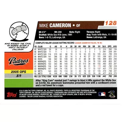 This is a 2006 Topps Mike Cameron autographed baseball card. This card has been signed, in black, by Mike Cameron, and is guaranteed authentic by Ballcardz.com. The card is #128 and is in NM-MT condition.