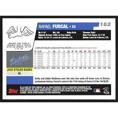 This is a 2006 Topps Rafael Furcal baseball card. The card is #162 and pictures show condition.