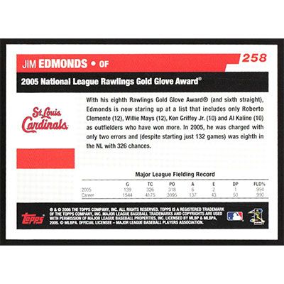 This is a 2006 Topps Jim Edmonds Award Winner baseball card. The card is #258 and pictures show condition.