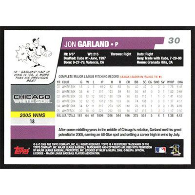 This is a 2006 Topps Jon Garland baseball card. The card is #30 and pictures show condition.