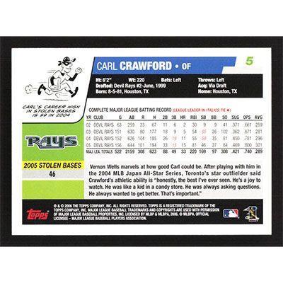 This is a 2006 Topps Carl Crawford baseball card. The card is #5 and pictures show condition.