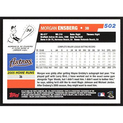 This is a 2006 Topps Morgan Ensberg baseball card. The card is #502 and pictures show condition.