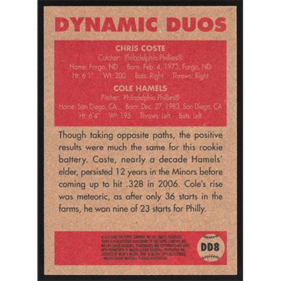 This is a 2006 Topps '52 Dynamic Duos Chris Coste and Cole Hamels baseball card. The card is #DD8 and pictures show condition. Team(s): Philadelphia Phillies