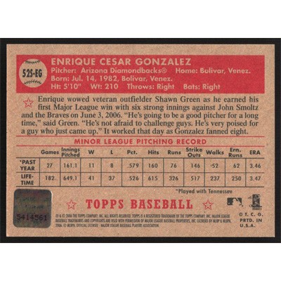 This is a 2006 Topps '52 Signatures Enrique Gonzalez autographed baseball card. This card has been signed, in blue, by Enrique Gonzalez, and is certified authentic by Topps. The card is #52S-EG and pictures show condition.