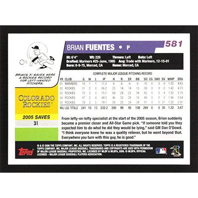 This is a 2006 Topps Brian Fuentes baseball card. The card is #581 and pictures show condition.