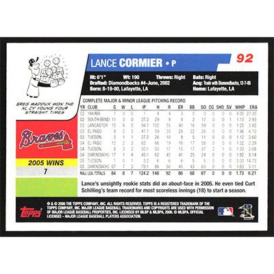 This is a 2006 Topps Lance Cormier baseball card. The card is #92 and pictures show condition.
