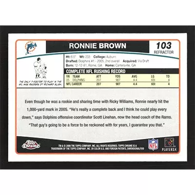 This is a 2006 Topps Chrome Refractors Ronnie Brown football card. The card is #103 and pictures show condition.