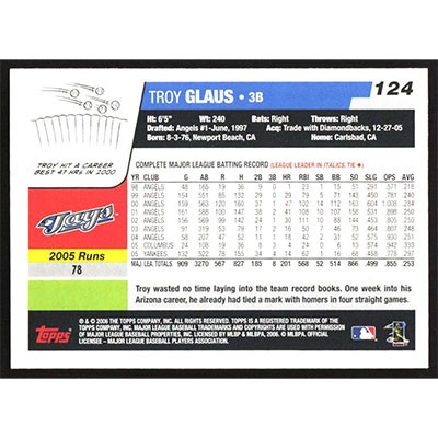 This is a 2006 Topps Opening Day Troy Glaus baseball card. The card is #124 and pictures show condition.
