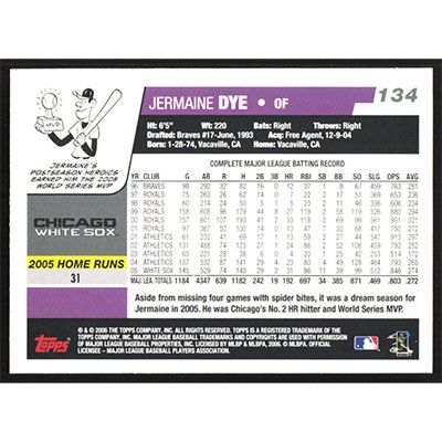 This is a 2006 Topps Opening Day Jermaine Dye baseball card. The card is #134 and pictures show condition.