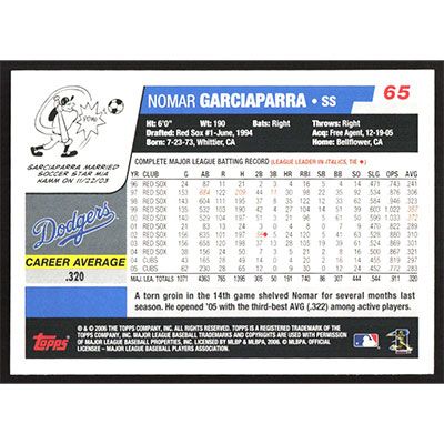 This is a 2006 Topps Opening Day Nomar Garciaparra baseball card. The card is #65 and pictures show condition.