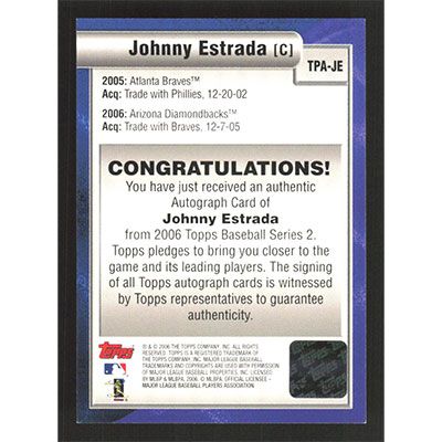 This is a 2006 Topps Trading Places Autographs Johnny Estrada autographed baseball card. This card has been signed, in blue, by Johnny Estrada, and is certified authentic by Topps. The card is #TPA-JE and pictures show condition.