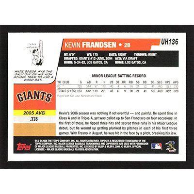 This is a 2006 Topps Update Kevin Frandsen baseball card. The card is #UH136 and pictures show condition. Team(s): San Francisco Giants Rookie Card (RC)
