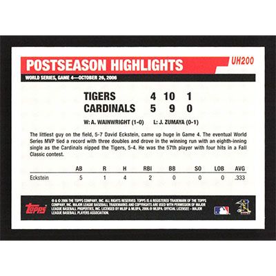 This is a 2006 Topps Update David Eckstein Postseason Highlights baseball card. The card is #UH200 and pictures show condition. Team(s): St. Louis Cardinals
