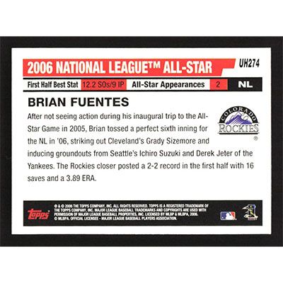 This is a 2006 Topps Update Brian Fuentes All-Star baseball card. The card is #UH274 and pictures show condition.