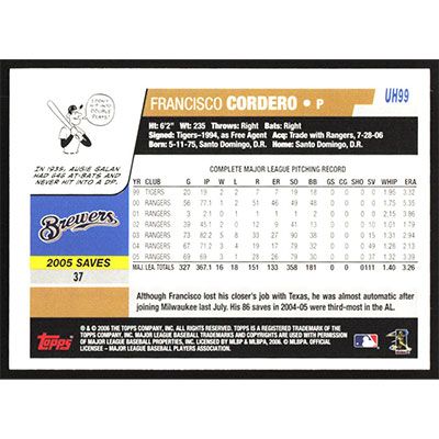This is a 2006 Topps Update Francisco Cordero baseball card. The card is #UH99 and pictures show condition.