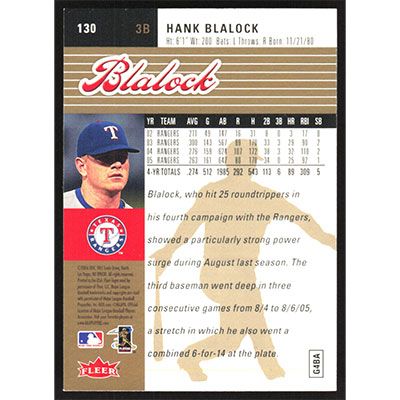 This is a 2006 Ultra Gold Medallion Hank Blalock baseball card. The card is #130 and pictures show condition.