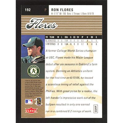This is a 2006 Ultra Gold Medallion Ron Flores baseball card. The card is #192 and pictures show condition. Team(s): Oakland Athletics Rookie Card (RC)