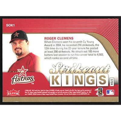 This is a 2006 Ultra Strikeout Kings Roger Clemens baseball card. The card is #SOK1 and pictures show condition.