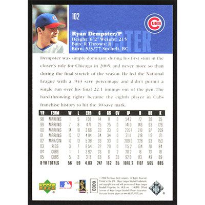 This is a 2006 Upper Deck Ryan Dempster baseball card. The card is #102 and pictures show condition.